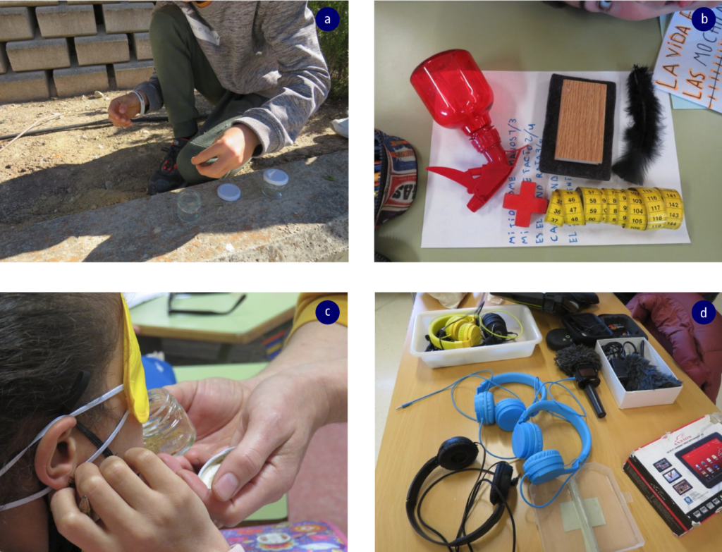 Figura 1. Procés de recol·lecció d’olors de l’entorn escolar per al seu posterior reconeixement (a); objectes utilitzats durant el treball de l’eix temàtic vinculat al tacte (b); una alumna intenta identificar una olor en una de les sessions de treball (c); dispositius utilitzats per Nil Gallego en l’eix temàtic del so (d)
