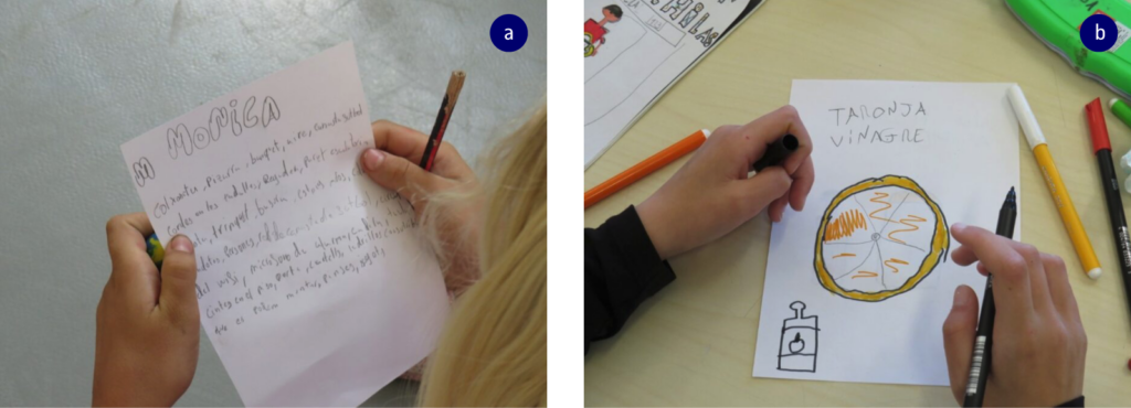 Figura 2. Llistat de paraules (a); utilització de la representació gràfica com a eina expressiva durant una de les sessions de l’eix temàtic de l’olor (b)